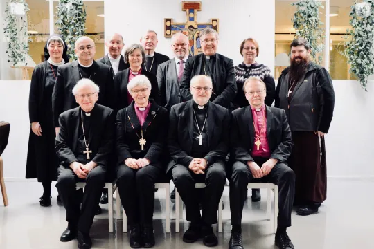 BISPEKONFERANSEN: 1. rad: biskop Teem Sippo, Helsinki; erkebiskop dr. Antje Jackelen, Sverige; kardinal Anders Arborelius OCD, Stockholm; erkebiskop dr. Kari Mäkinen, Turku/Åbo og Finnland. 2. rad: biskop Berislav Grgic, Tromsø; biskop og primas for Den norske kirke Helga Haugland Byfuglien; biskop og primas for Den danske kirke Peter Skov-Jakobsen, København; biskop Czeslaw Kozon, København; biskop Agnes M. Sigurðardóttir, Island; biskop David Tencer, Reykjavik. 3. rad: Sr. Anna Mirijam Kaschner; biskop emeritus Peter Bürcher, Reykjavik; biskop Bernt Eidsvig, Oslo katolske bispedømme. Foto: Marko Tervarportti