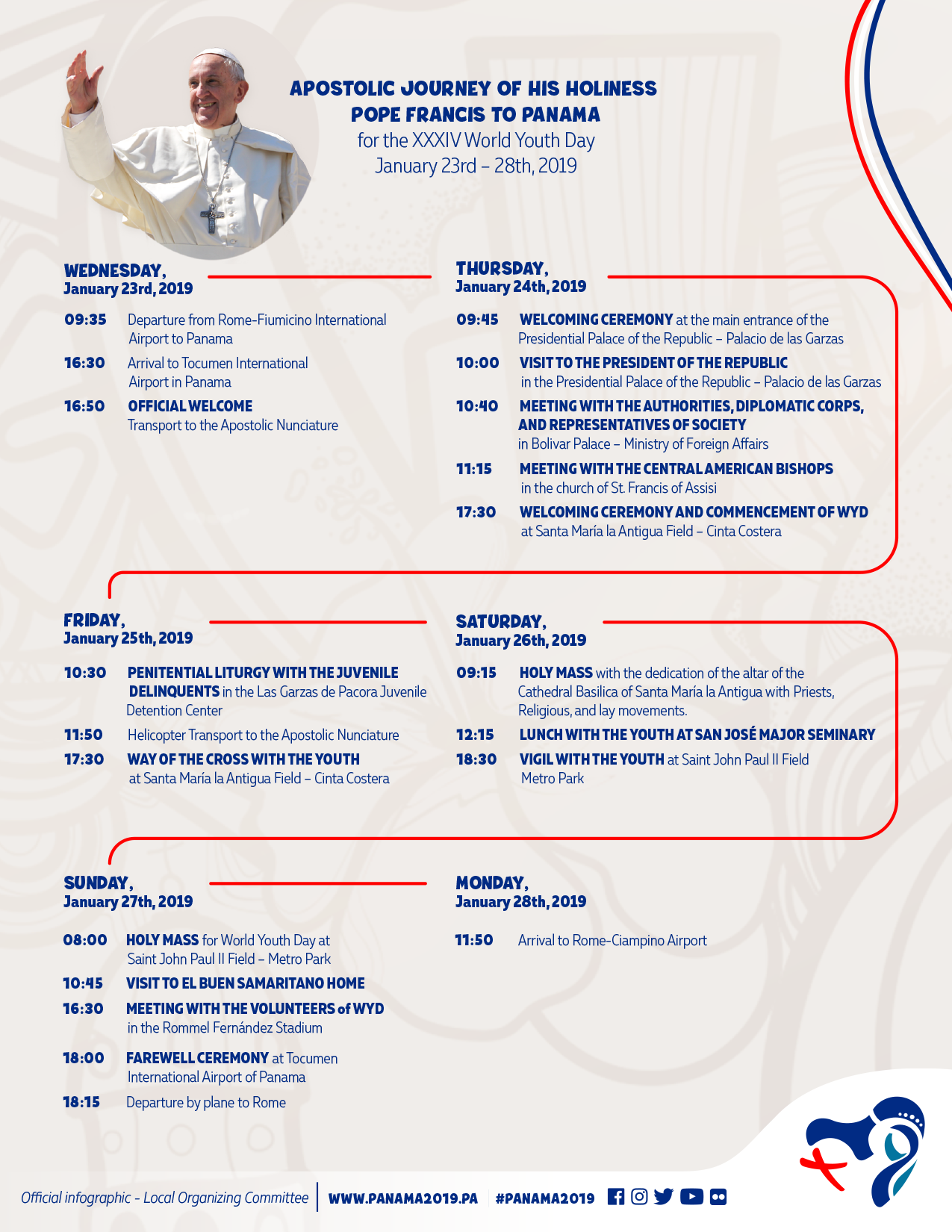 – Verdensungdomsdagene er pavens invitasjon til katolikker for å treffes i et vertsland og feire gleden, eukaristien og evangeliet under verdens største messe, sier tursjef Stephan Trotter. Vertslandet denne gang er Panama, noe som gledet mange, men spesielt den panamanske president Juan Carlos Varela. Pave Frans kunngjorde avgjørelsen under forrige WYD, som ble arrangert i Krakow.