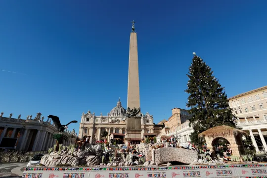 PAVENS JULETRE:I år ble juletreet på Petersplassen tent fredag 10. desember. Det er 28 meter høyt, veier 28 tonn og kommer fra den lille landsbyen Andalo i Dolomittene. Treet er dekorert med 600 trekuler, som er laget av lokale håndverkere. Foto: Reuters / NTB