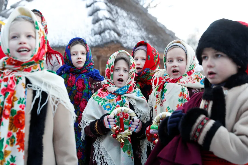 JULEFEIRING: 7. Januar 2022 møttes ukrainske barn for å synge julesanger i Kyiv. Foto: Valentyn Ogirenko, NTB.