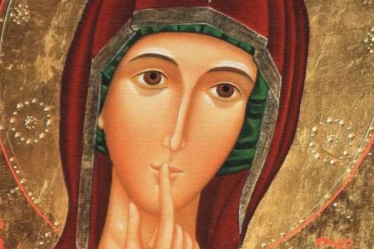 VÅR FRUE AV STILLHETEN: Ikon av benediktinernonnene i Novara. Da paven velsinet ikonet, skrev han "Ikke snakk nedlatende om andre" på baksiden. Han fikk hengt opp en kopi av ikonet ved heisen til det apostoliske palasset i Vatikanet. Foto: Vatican News