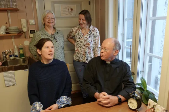 KATEKETISK SENTER: Pater Oddvar Moi, Terese Arpas Ranek (foran t.v.), Maria Fongen (bak t.v.) og Camilla Cselenyi utgjør Kateketisk senter som holder til i «Lille Vatikanet», Oslo. Foto: Linda Therese Utstøl