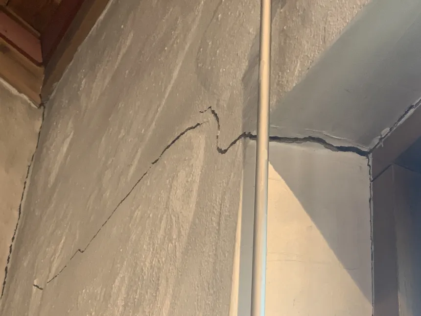 SKADER: Kirkebygget har tydelige sprekker i veggen. Foto: P. Josef Ottersen.