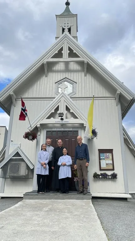 BESØK I NORD: Geralpriorinne, sr. Mary Thanh Trang og sr. Therese fra Vietnam på besøk I Harstad juli 2023. F.v.: sr. Mary, p. Antonius Maria Sohler (daværende generalvikar Tromsø stift), p. Gunther Josef Jäger (sogneprest i Harstad), sr. Therese, Ulrik Sverdrup-Thygeson (økonom i Tromsø stift).